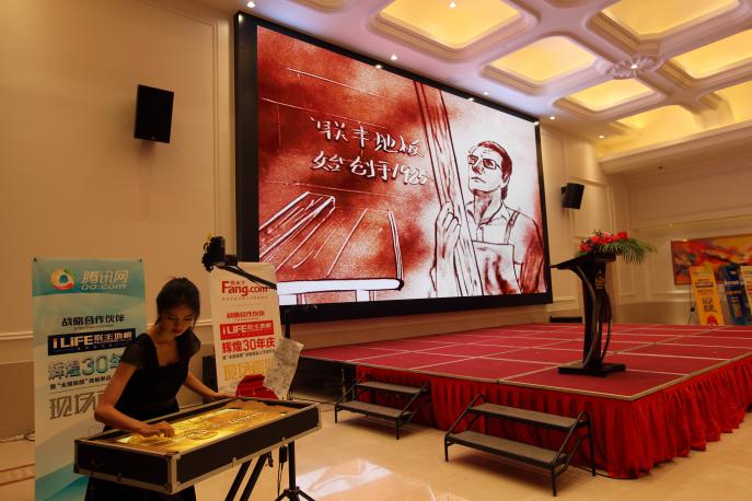 沙畫師從拓荒、崛起、騰飛、突破、卓越、王者六個階段在展現一門獨特藝術的同時,更將一個鮮活的聯豐30年發展歷程展示給世人,使現場每一個人進入夢幻般的感覺和前所未有的視覺享受,博得陣陣喝彩。