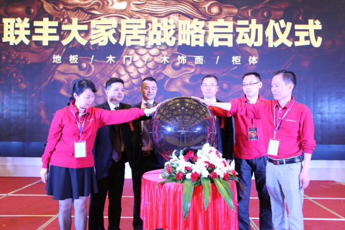 今天,聯豐大家居戰略終于到了孕育成熟的時刻,接下來有請蘇州聯豐木業有限公司董事長沈建新先生、蘇州聯豐木業有限公司副總經理李玉明先生、蘇州聯豐木業有限公司生產總監沈建強先生、湖南聯豐彭桂香女士、四川聯豐總經理王宇航先生以及建立全國第一家整木家居館的淮安聯豐總經理徐建華先生共同為我們啟動“聯豐大家居戰略”。
