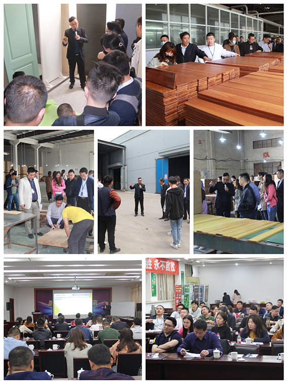 邢總一行先后參觀了聯豐地板、木門、木飾面綜合體驗展廳和嚴苛的生產流水線,對聯豐在產品研發、生產管控各個環節上所作的努力高度認可和贊賞,尤其聯豐地板在產品差異化諸如全屋除醛、醛凈康等產品細分領域的競爭力,在行業內可謂享有盛名。隨后,李總作了地板鋪裝規范主題培訓,對木材基礎知識、地板產品知識、地板鋪裝方法與主要控制點以及使用規范、售后服務分析和案例解讀等作了精彩分享。雙方就實際施工中所岀現的問題及門店的作業流程與管理規范進行了深入、有效溝通。