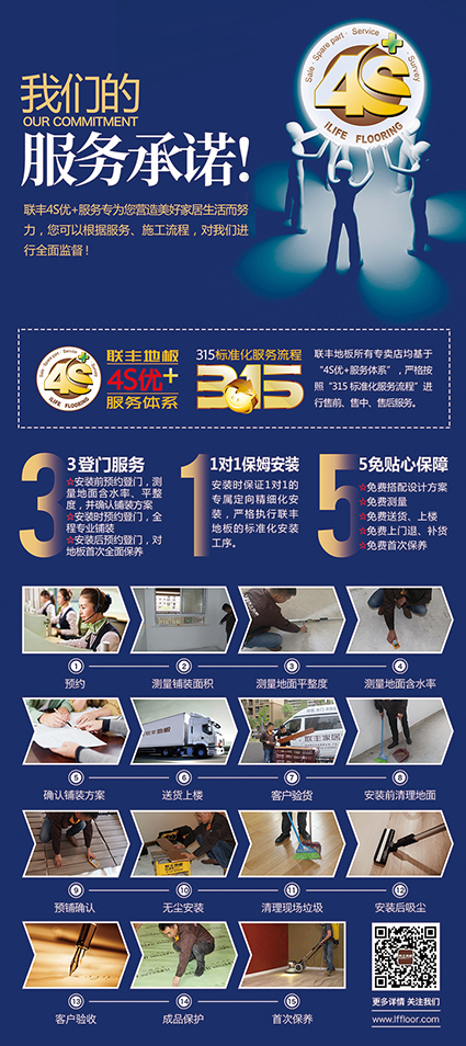 眾所周知,當(dāng)今市場的競爭已然不是單純產(chǎn)品、花色和價格的競爭,而是服務(wù)等多元化的競爭,利用“服務(wù)營銷”打造門店核心競爭力,讓服務(wù)創(chuàng)造價值,是聯(lián)豐三十多年的持續(xù)追求。早在2010年,為拉升品牌高度,增強渠道生命力,提升消費者認(rèn)同,聯(lián)豐就推出了專屬的4S優(yōu)+服務(wù)體系,從地板銷售(Sale),到輔料配件(Spare part),售前售后服務(wù)(Service),再到信息反饋(Survey),每一個流程都做到規(guī)范化運作,并要求全國千家門店都要嚴(yán)格按照“315標(biāo)準(zhǔn)化服務(wù)流程”進行售前、售中、售后服務(wù)。