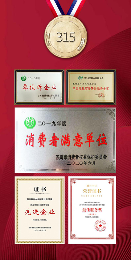 2003年,聯(lián)豐榮獲質(zhì)量和售后服務(wù)30家雙承諾企業(yè)。2005年,榮獲“中國木地板30家市場放心品牌”。2010年,全國367個地級以上城市調(diào)查,榮獲“經(jīng)銷商首推實木地板品牌”以及蘇州市消費者權(quán)益保護委員會“零投訴企業(yè)”。2018年,世界木地板大會,榮獲“中國地板質(zhì)量售后服務(wù)金獎”。2019年,榮獲江蘇省放心消費創(chuàng)建活動辦公室“先進企業(yè)”。2020年,榮獲蘇州市消費者權(quán)益保護委員會“消費者滿意單位”。聯(lián)豐服務(wù)規(guī)范化為聯(lián)豐品牌化插上騰飛翅膀的同時,也直接助力在市場上的強勢表現(xiàn),作為國內(nèi)家裝領(lǐng)域的頭部企業(yè),聯(lián)豐在與金螳螂·家的戰(zhàn)略合作中,連續(xù)于2018年、2019年在其眾多的合作伙伴中脫穎而出,榮獲“最佳服務(wù)獎”。
