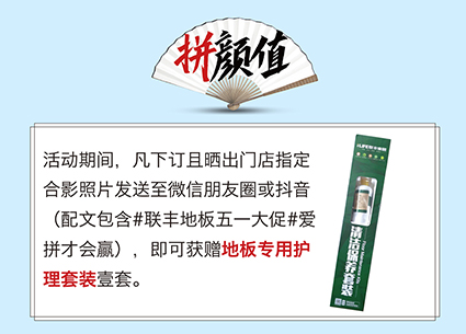 活動期間,凡下訂且曬出門店指定合影照片發(fā)送至微信朋友圈或抖音(配文包含#聯(lián)豐地板五一大促#愛拼才會贏),即可獲贈地板專用護理套裝壹套。