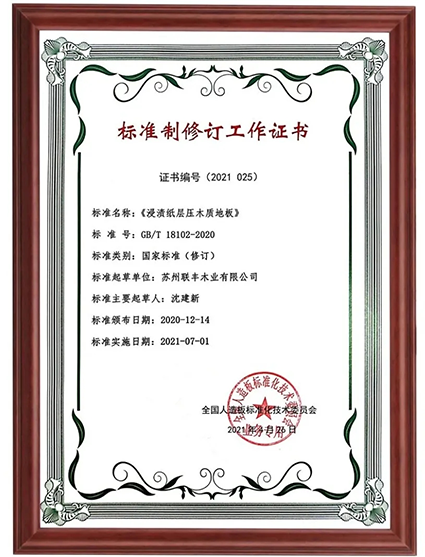 作為標準化示范企業,聯豐一直對企業標準的制定極為重視,尤其在技術、服務、業態不斷更新迭代的當下,聯豐認為高標準的制定將極大地推進地板產業的高質量成長。在蓬勃發展的十多年里,聯豐用實際行動積極參與制定、修訂實木地板、強化地板、地采暖木質地板、高耐磨漆飾實木地板等國家標準,地采暖用實木地板鋪裝、驗收規范,負氧離子木地板等行業標準,為中國地板行業的標準化、制度化建設貢獻力量,推動行業高質量發展。