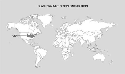 生于北緯35-45度,西經80-120度之間的美國東部和美國西海岸加利福尼亞州及西得克薩斯州的廣闊葉林。因受夏季炎熱冬季高寒氣候環境的千錘百煉,北美黑胡桃生長速度極為緩慢,平均每棵樹的生長周期為50-100年方可成。