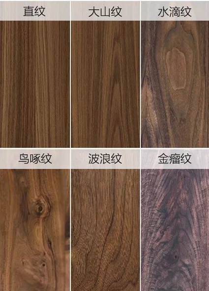 德國哲學家萊布尼茨說過“世界上沒有完全相同的兩片樹葉”,不同之中也有相同,個性之中也有共性,木材也不例外,黑胡桃木主要有六種紋理,分別是直紋、大山紋、水滴紋、鳥啄紋、波浪紋以及金瘤紋。