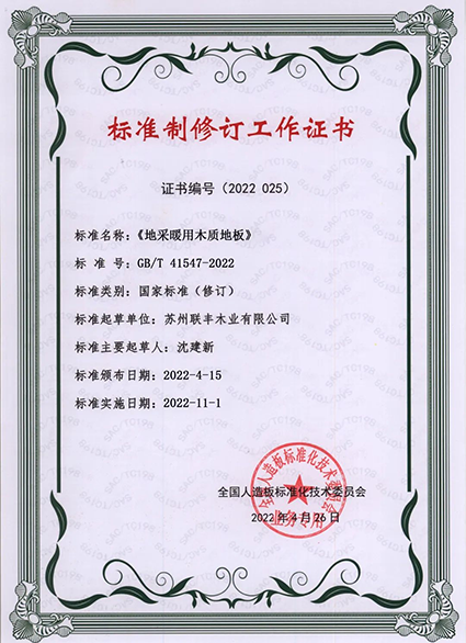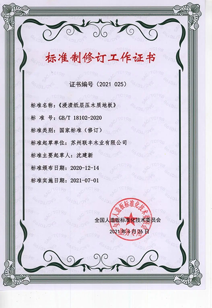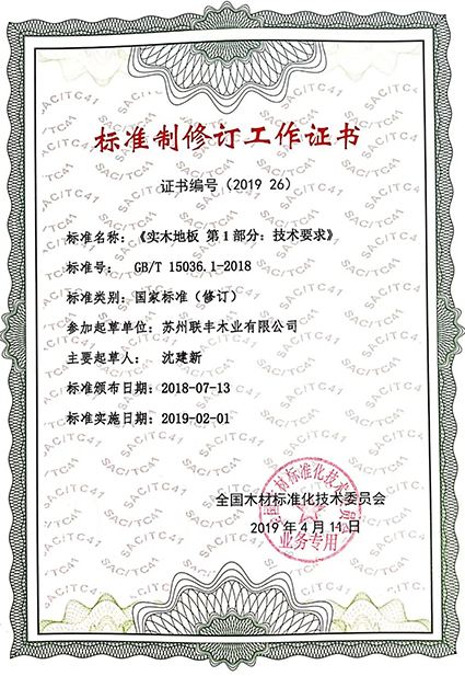 聯豐地板坐落于中國實木地板產業基地,對實木及實木復合地板地板的生產技術、加工及檢驗標準更有心得。作為中國實木地板之父,聯豐地板當仁不讓地成為GB/T 15036.1-2018《實木地板》的重要起草單位;敢于創新的聯豐地板,積極探索實木復合地板的更多可能,受邀成為了GB/T 18103-2013《實木復合地板》、GB/T 18102-2020《浸漬紙層壓木質地板》國家標準的起草單位。