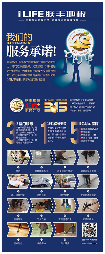 聯豐地板日常執行的企業標準,各項指標的要求遠高于國家、行業標準,所以聯豐才有信心作明確的品質保障,建立4S優+服務體系,嚴格按照“315標準化服務流程”進行操作,讓經銷商或消費者得到對等的價值保障。