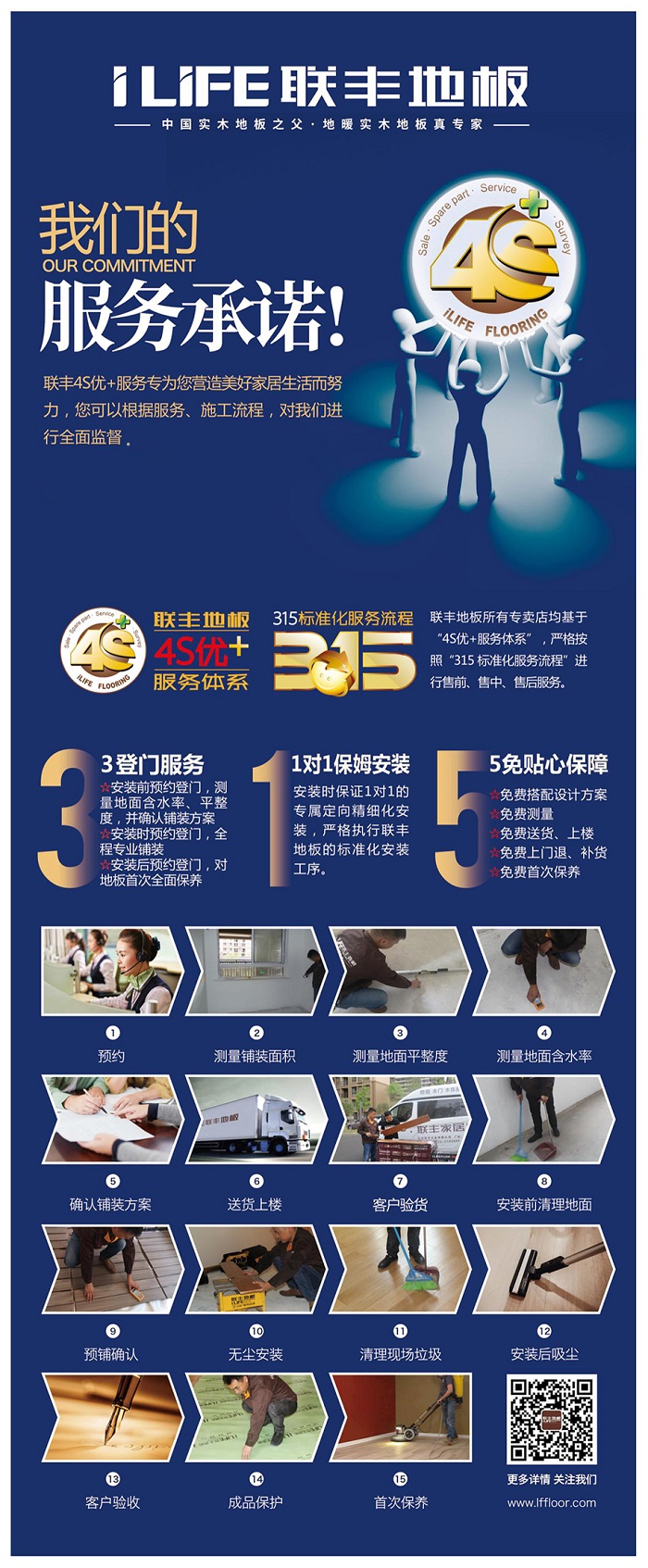 2010年,聯豐就推出了專屬的4S優+服務體系,從地板銷售(Sale),到輔料配件(Spare part),售前售后服務(Service),再到信息反饋(Survey),每一個流程都做到規范化運作,并要求全國千家門店都要嚴格按照“315標準化服務流程”進行售前、售中、售后服務。