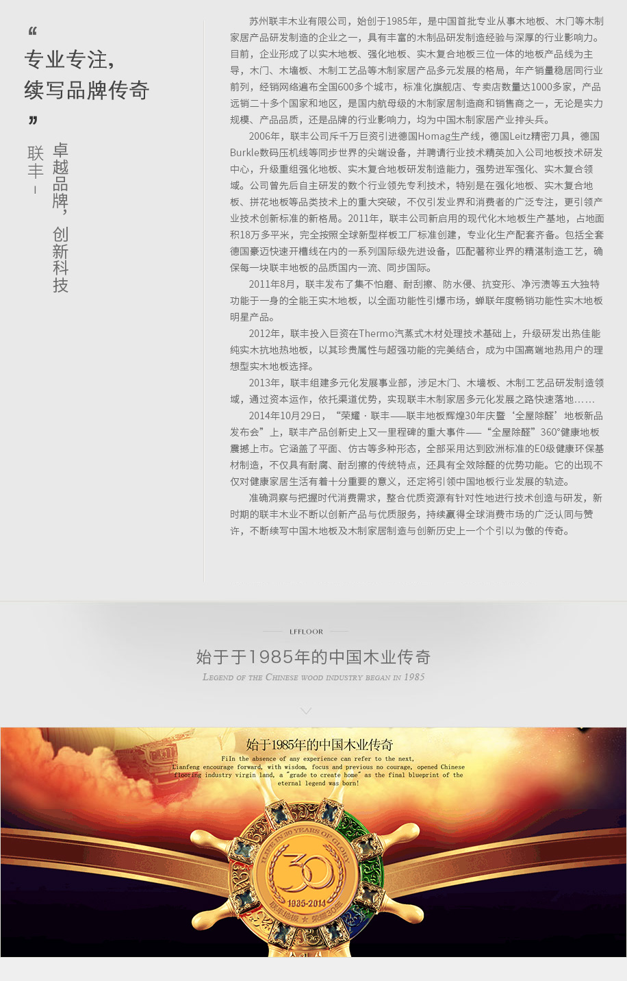蘇州聯(lián)豐木業(yè)有限公司,始創(chuàng)于1985年,是中國(guó)最早專業(yè)從事木地板、木門等木制家居產(chǎn)品研發(fā)制造的企業(yè)之一,具有豐富的木制品研發(fā)制造經(jīng)驗(yàn)與深厚的行業(yè)影響力。目前,企業(yè)形成了以實(shí)木地板、強(qiáng)化地板、實(shí)木復(fù)合地板三位一體的地板產(chǎn)品線為主導(dǎo),木門、木墻板、木制工藝品等木制家居產(chǎn)品多元發(fā)展的格局,年產(chǎn)銷量穩(wěn)居同行業(yè)前列,經(jīng)銷網(wǎng)絡(luò)遍布全國(guó)600多個(gè)城市,標(biāo)準(zhǔn)化旗艦店、專賣店數(shù)量達(dá)1000多家,產(chǎn)品遠(yuǎn)銷二十多個(gè)國(guó)家和地區(qū),是國(guó)內(nèi)最大的木制家居制造商和銷售商之一,無(wú)論是實(shí)力規(guī)模、產(chǎn)品品質(zhì),還是品牌的行業(yè)影響力,均處于中國(guó)木制家居產(chǎn)業(yè)領(lǐng)軍地位。