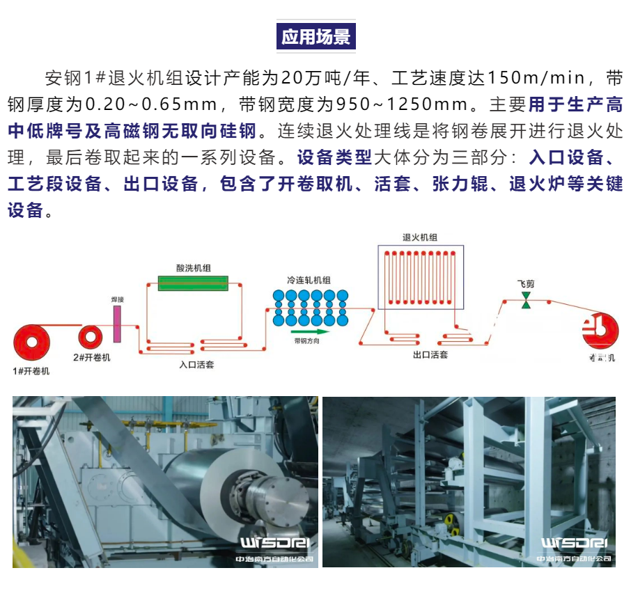 硅鋼是含硅量相對高的一種電工鋼,主要用于電機和變壓器的鐵芯,是電力、電子和軍事工業中一種重要的軟磁合金。硅鋼生產工藝復雜、工藝參數控制窗口窄、現場生產控制難度大,除了要有高潔凈鋼的冶煉,高性能的精密軋制,還需要高質量的退火涂層工藝技術。在退火涂層工藝處理過程中,退火溫度、張力和速度控制對硅鋼各項電磁性能指標起決定性作用。