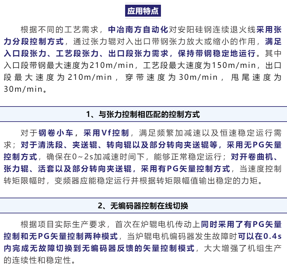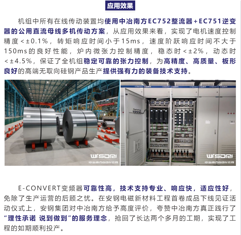 因此,具有高性能、高可靠性的核心部件——變頻器,已成為高品質硅鋼生產的重要保證。中冶南方E-CONVERT變頻器以15年的技術積淀,在此領域取得突破,成功應用于安鋼冷軋電磁新材料工程1#硅鋼連續退火涂層機組SCAL1,開創了國產變頻器在冷軋連退處理線的全線應用的先例,在冶金連續生產中對于國產替代進口具有示范意義。